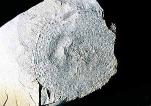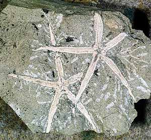 | ウニ・ヒトデ・クモヒトデ・ウミユリ・ナマコは一つの大きなグループ、棘皮動物門にまとめられています。 棘皮動物の特徴は、石灰質の小板を柔かな組織で結合させ体を作っています。この石灰質の小板に棘を持っていることがあります。柔らかい組織は"キャッチ結合組織"と呼ばれ、硬さの変わる組織で、ナマコに刺激を与えたときに硬くなったりしたり、クモヒトデの腕の自切するときの組織です。この組織は管足とともに棘皮動物の特徴となっています。この組織のために棘皮動物は、死後体がバラバラになりやすい傾向があります。また、体の体制が他の動物が持つ左右対称ではなく、中心の軸のまわりに五つの同一構造が放射状に配列した五放射相称の体制を持つのも特徴です。 師崎層群からは多くの棘皮動物化石が見つかっています。その多くは不正形ウニのタヌキブンブク(Brissopsis sp.)の仲間が多いですが、新生代には珍しいウミユリ類や深海性のヒトデ類も発見されました。 |